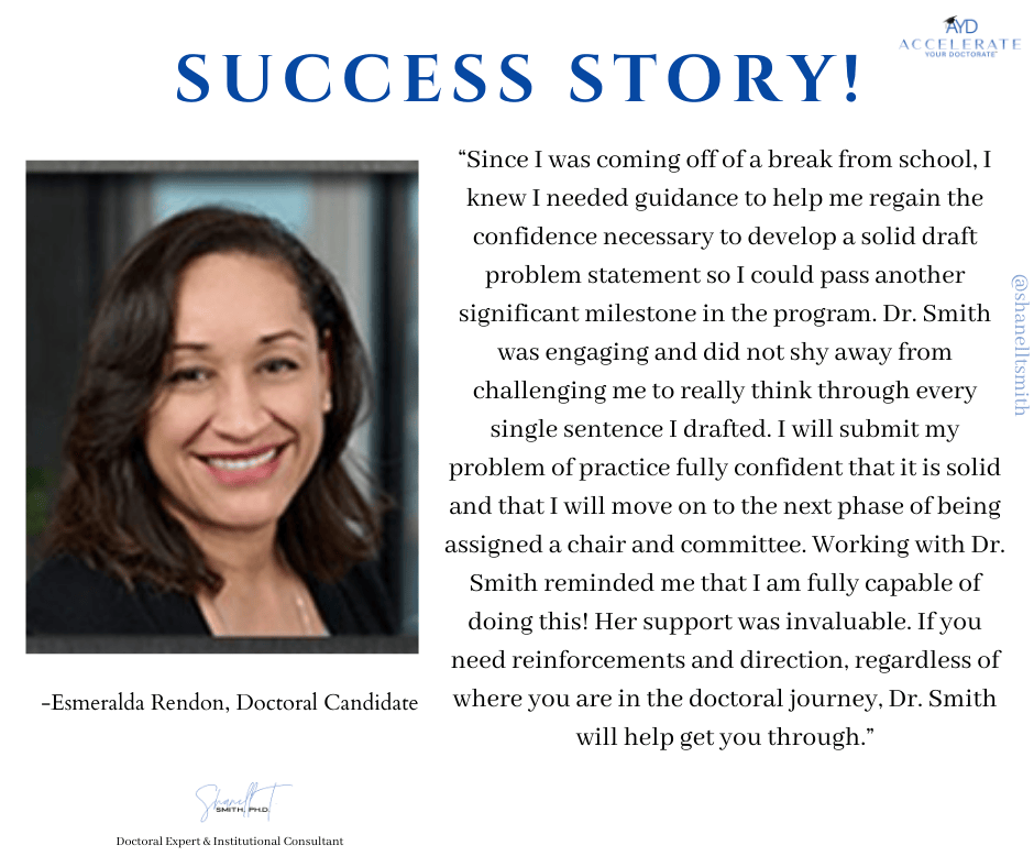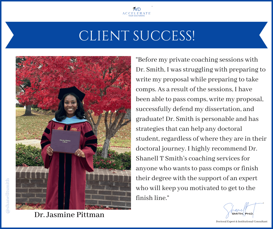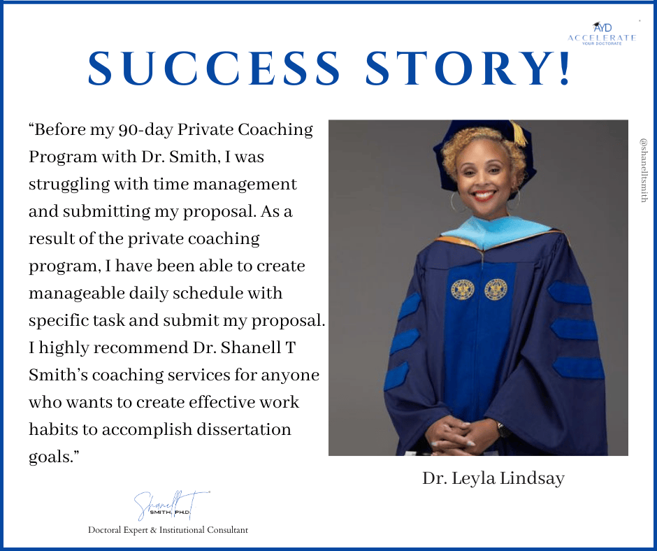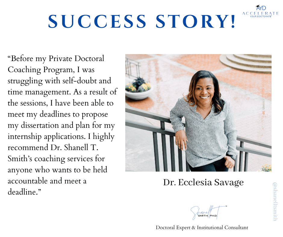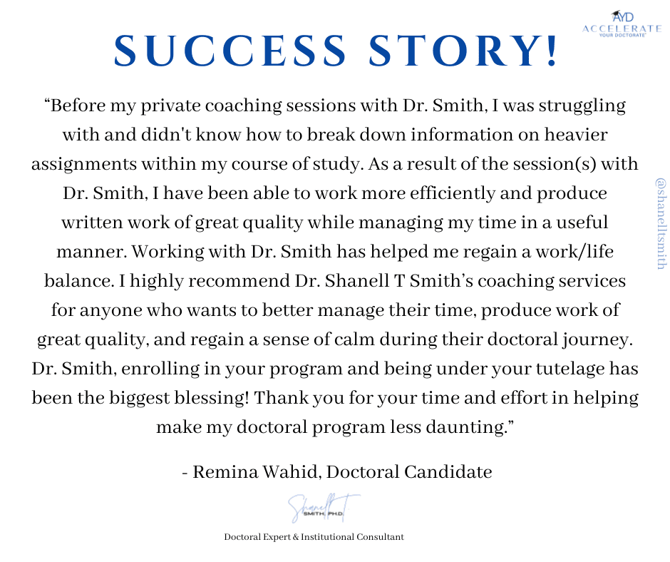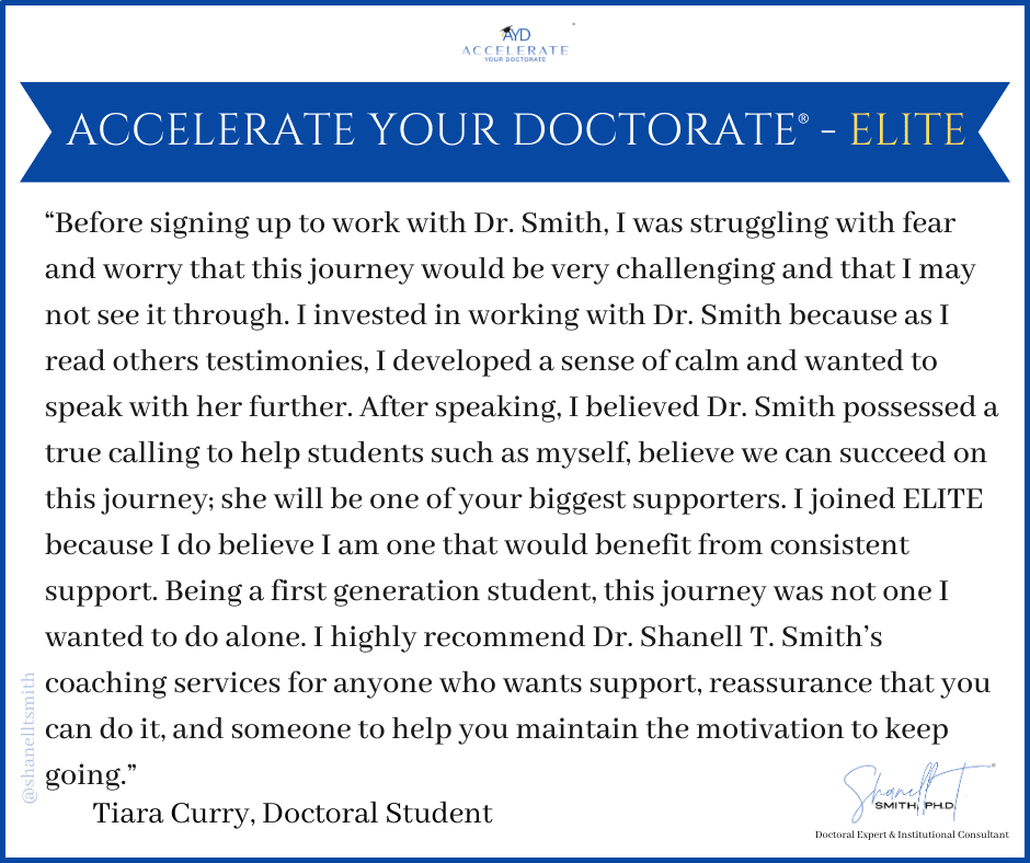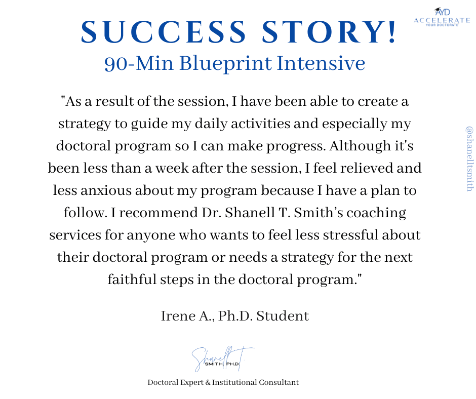 For this reason, I created my proven Accelerate Your Doctorate® Method. Through private and group coaching programs, I help doctoral students from start to FINISH.