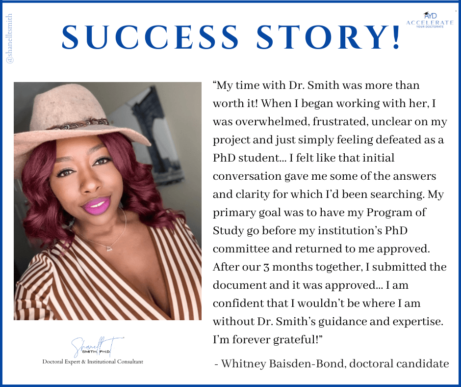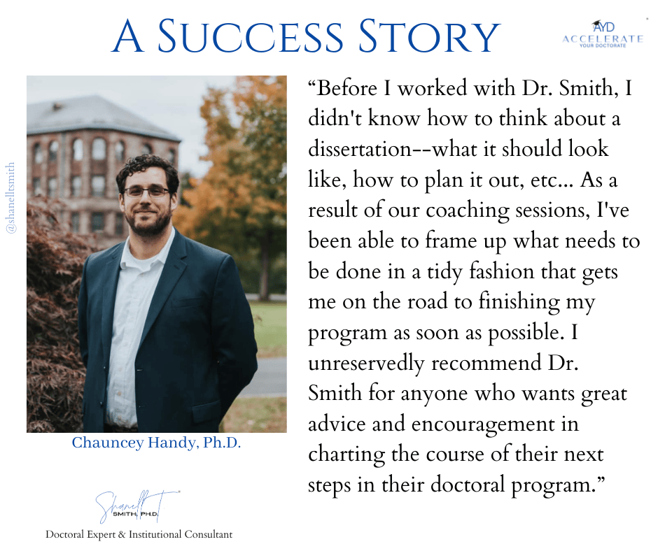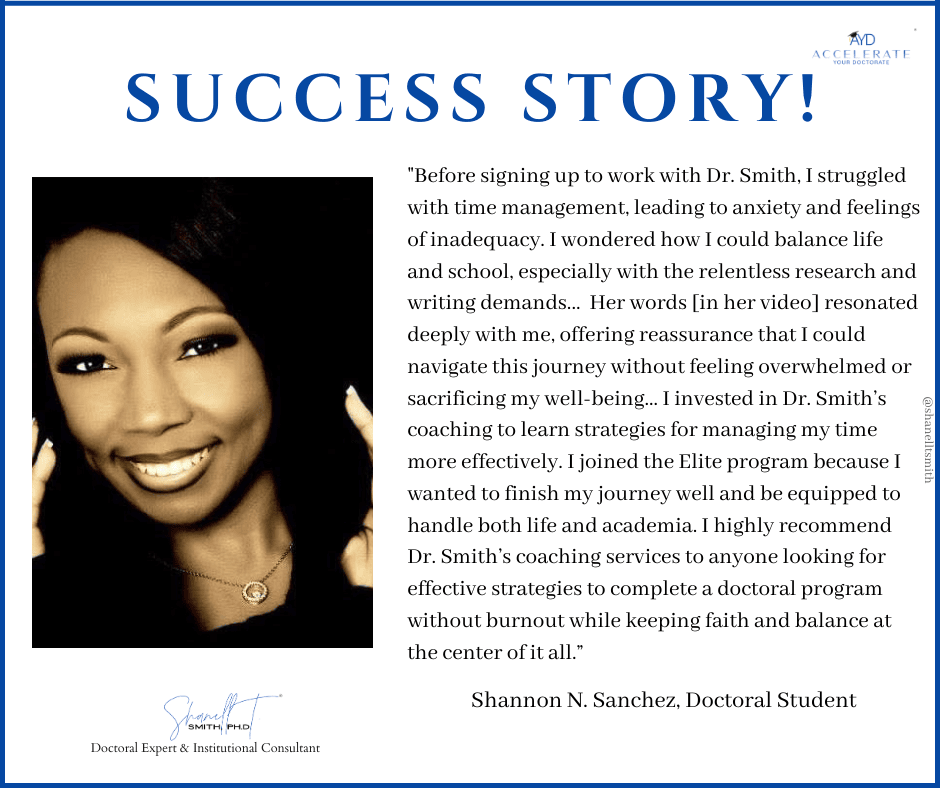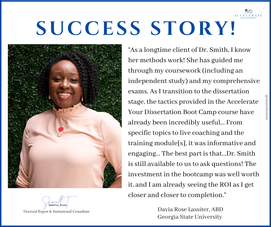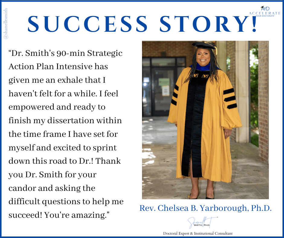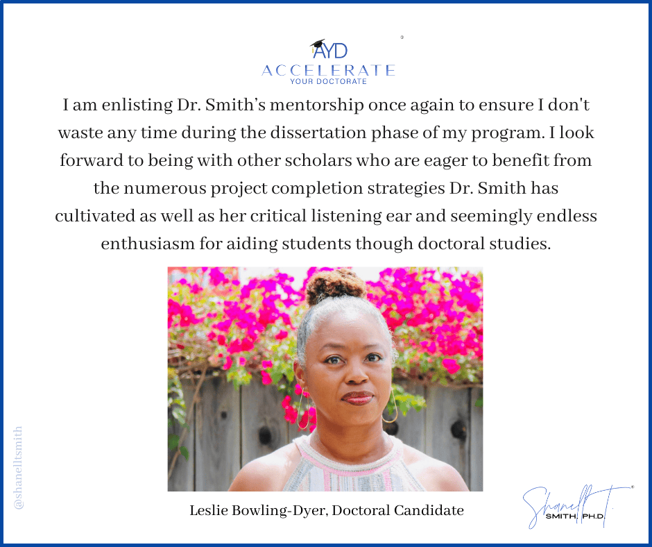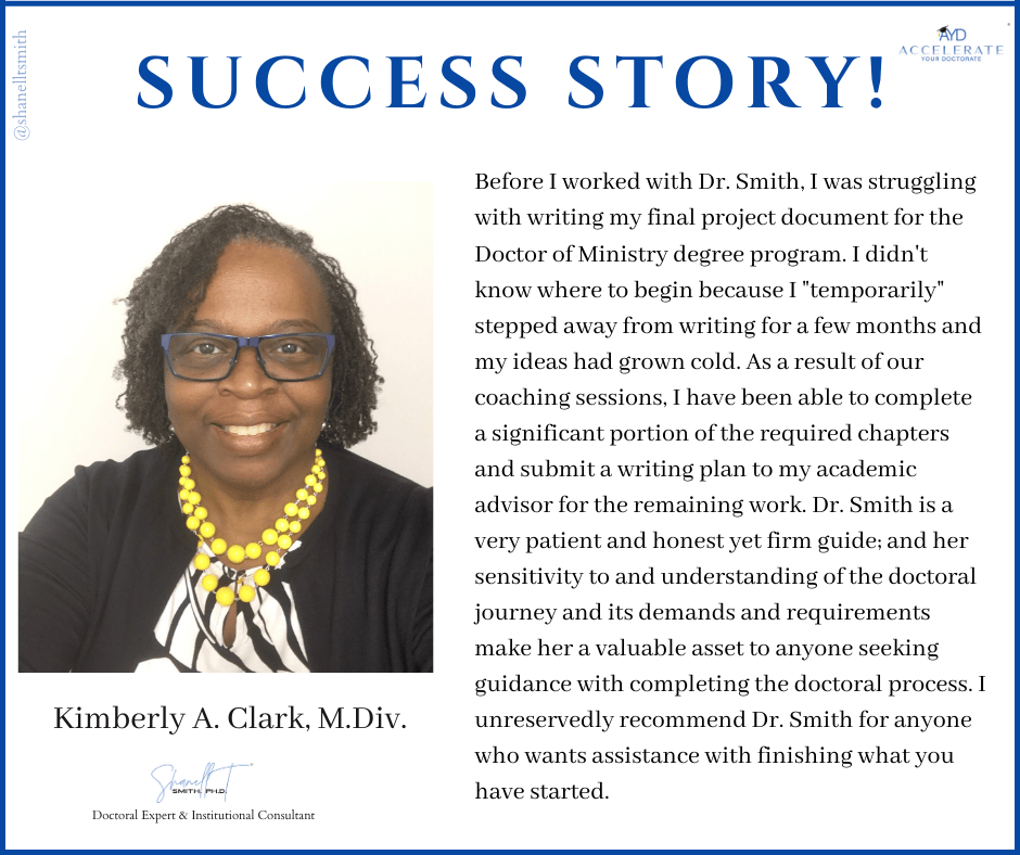 For this reason, I created my proven Accelerate Your Doctorate® Method. Through private and group coaching programs, I help doctoral students from start to FINISH.
