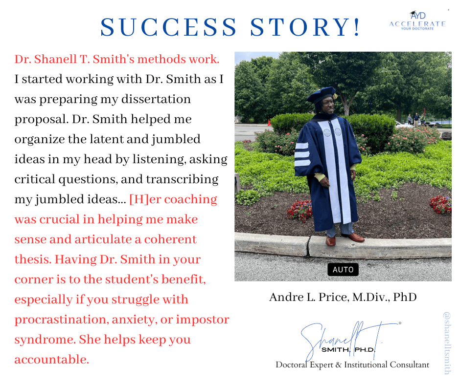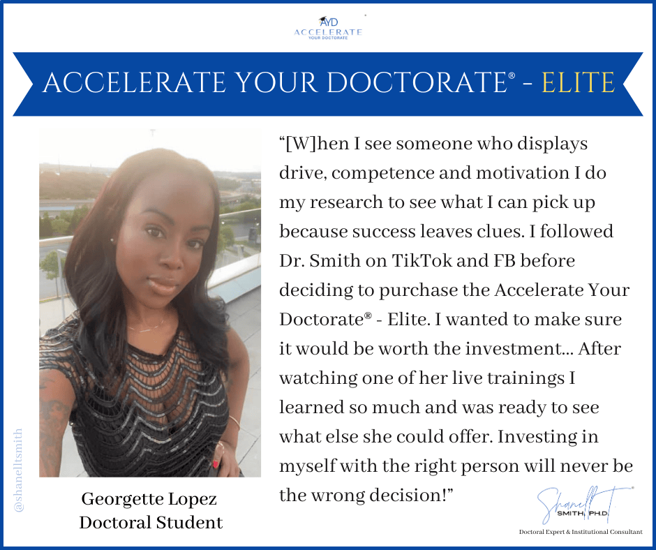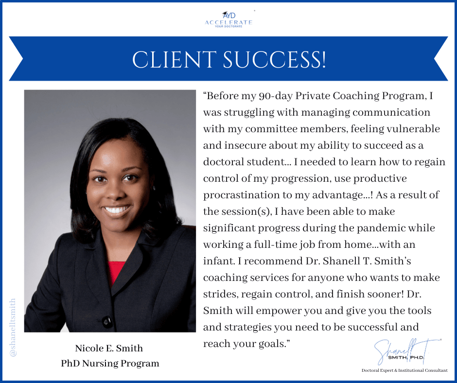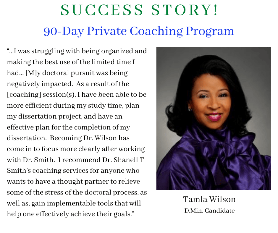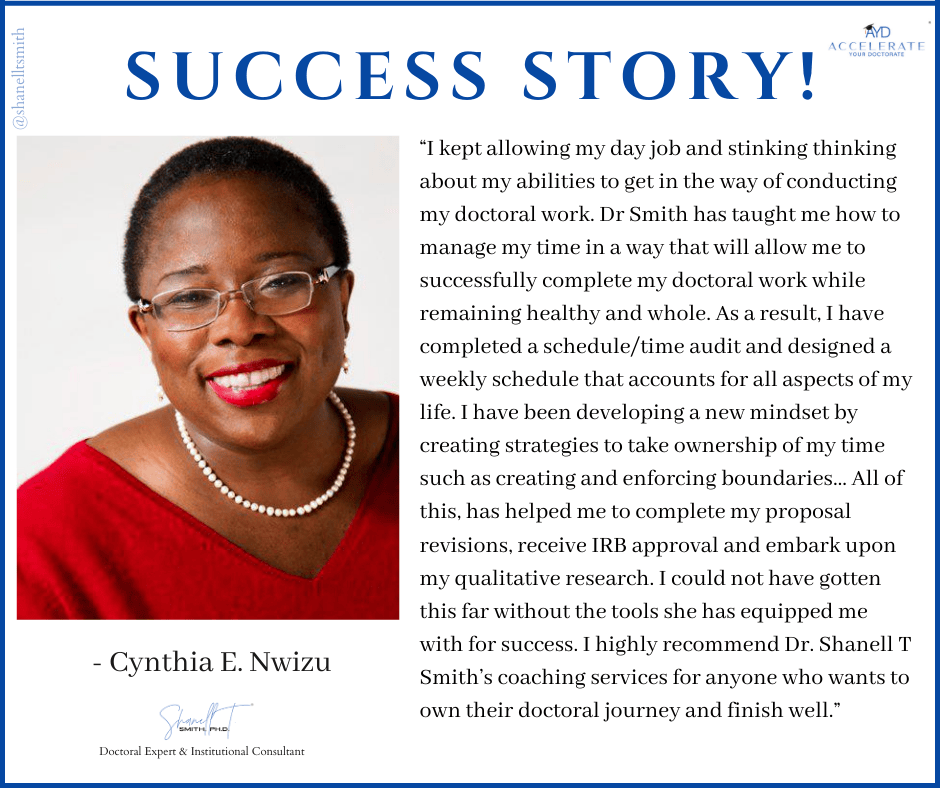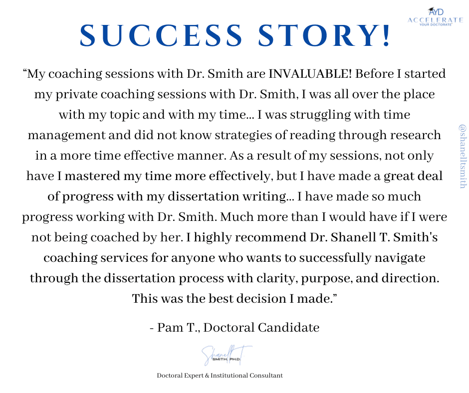 For this reason, I created my proven Accelerate Your Doctorate® Method. Through private and group coaching programs, I help doctoral students from start to FINISH.
