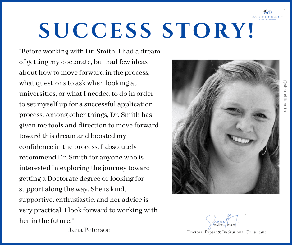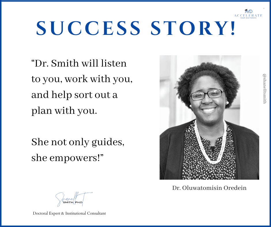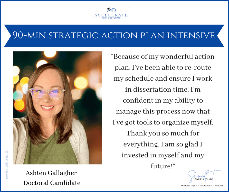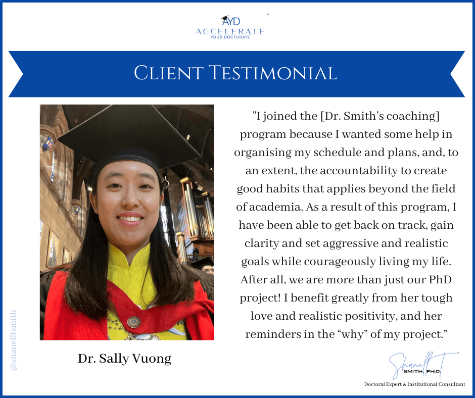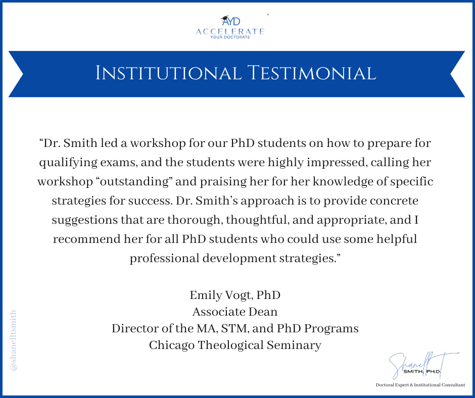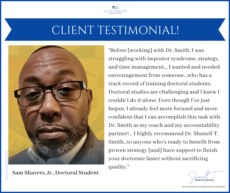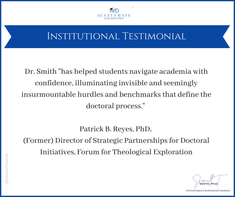For this reason, I created my proven Accelerate Your Doctorate® Method. Through private and group coaching programs, I help doctoral students from start to FINISH.