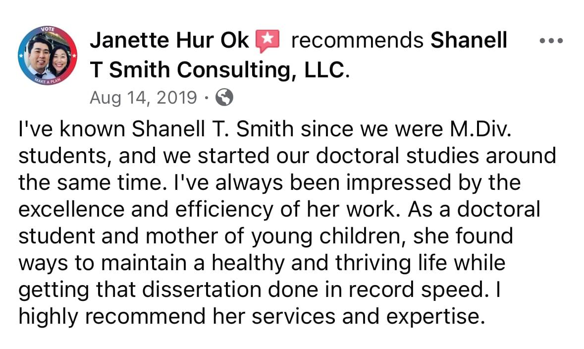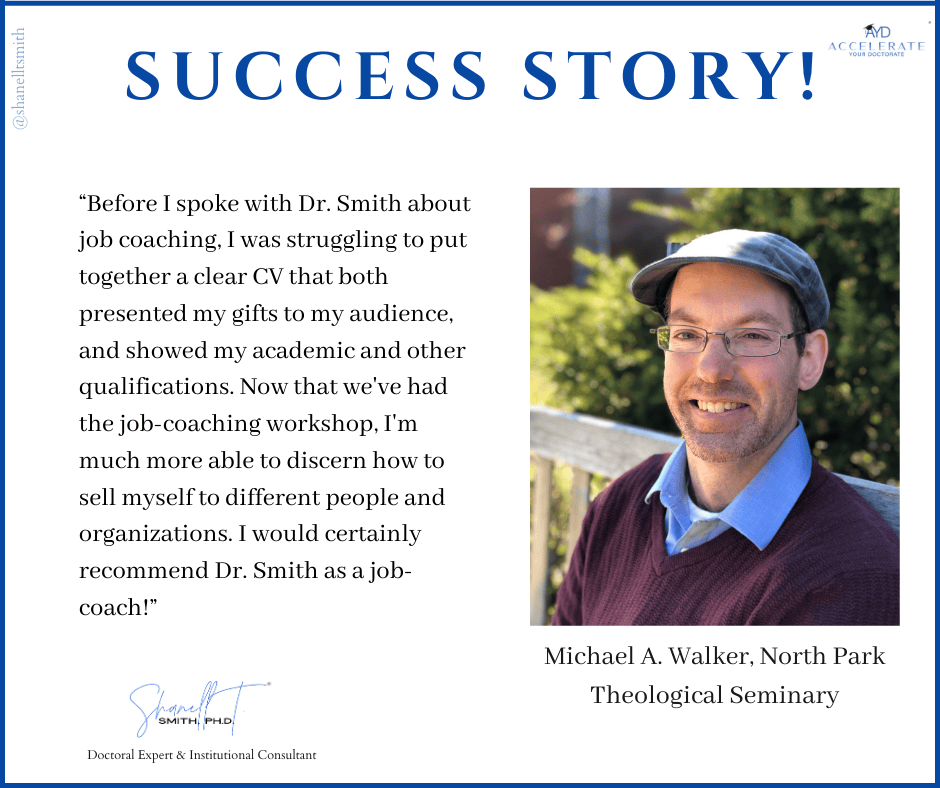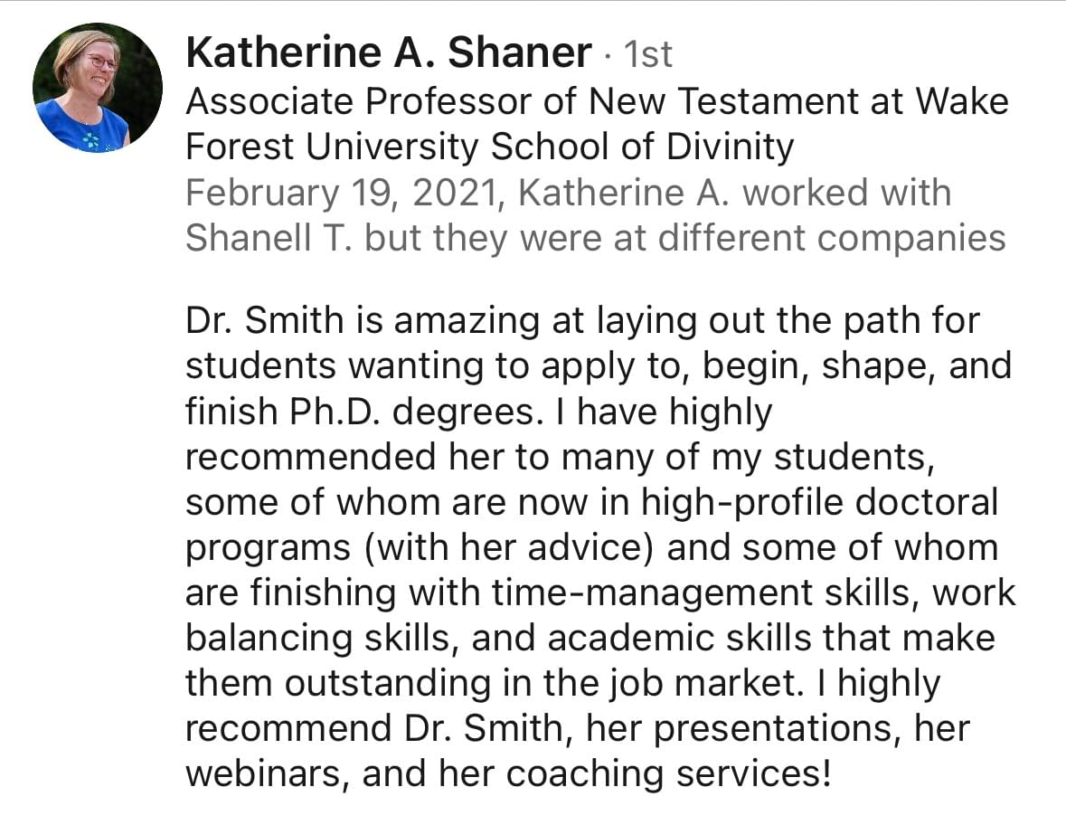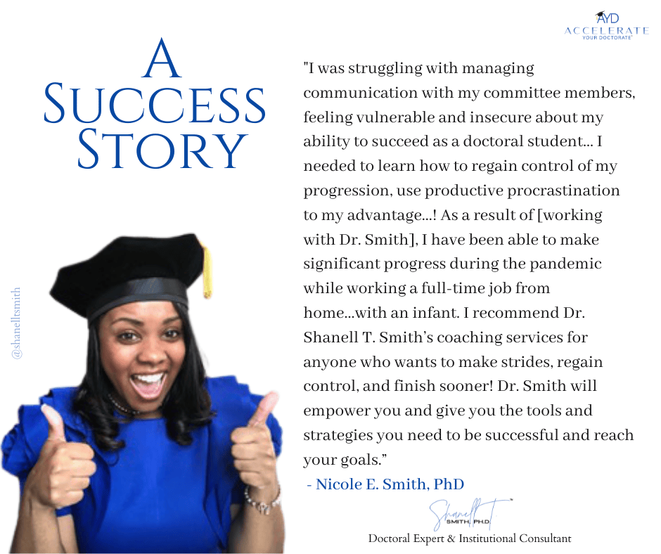 I help doctoral students successfully navigate the various stages of their program with ease so they can not only finish faster, but finish faster without sacrificing their quality of life.